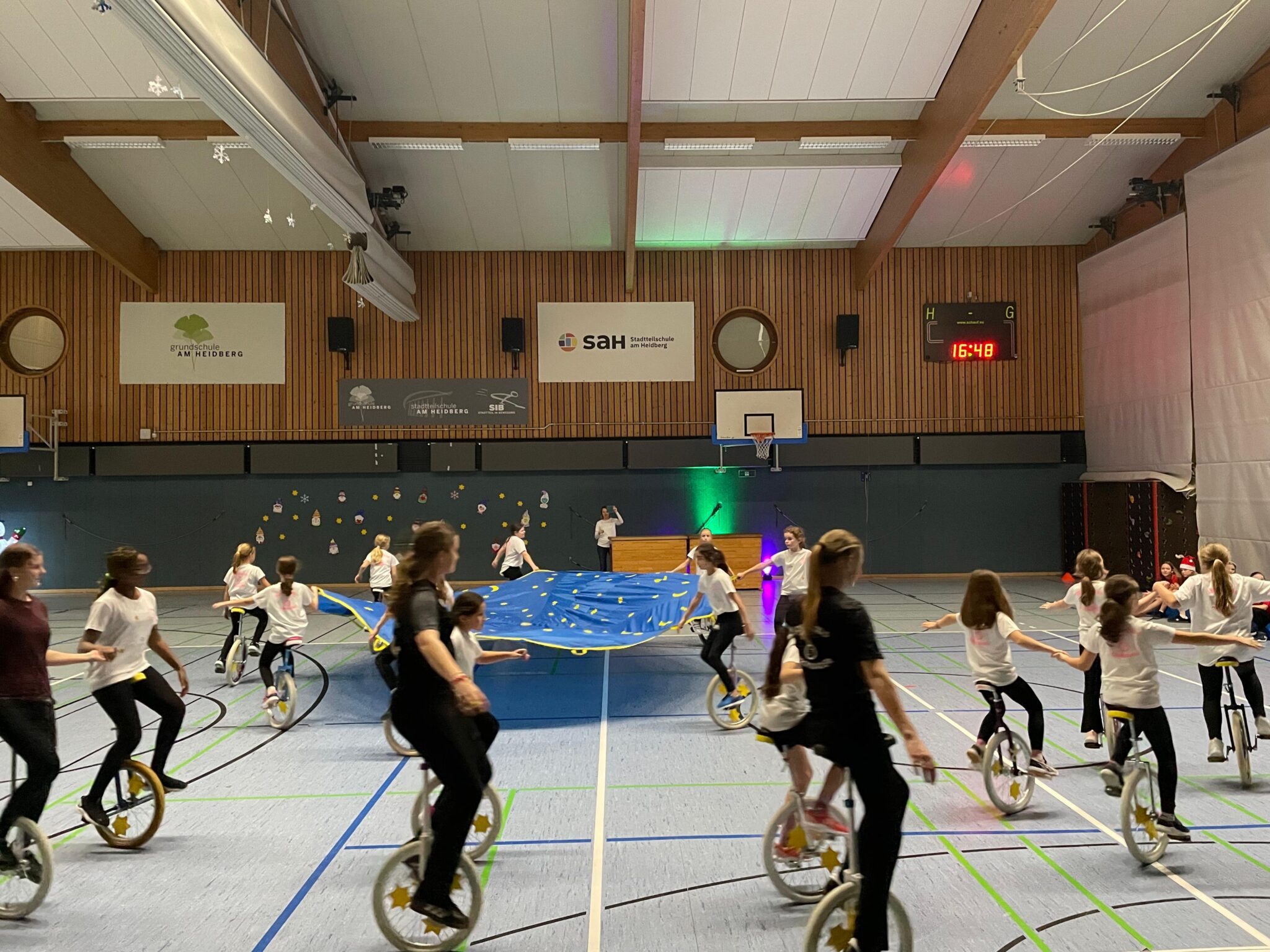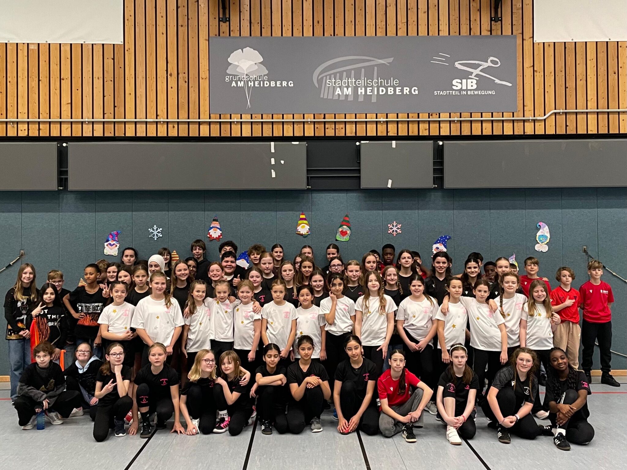 Am Dienstag, den 9. Dezember, wurde es in unserer Sporthalle besonders festlich: Die fast 450 Kinder der Grundschule Am Heidberg sowie zwei Vorschulklassen der benachbarten Schule waren eingeladen zu einem ganz besonderen Weihnachtsspecial – mit Einrad- und Tanzaufführungen, die für große Augen und viel Applaus sorgten.