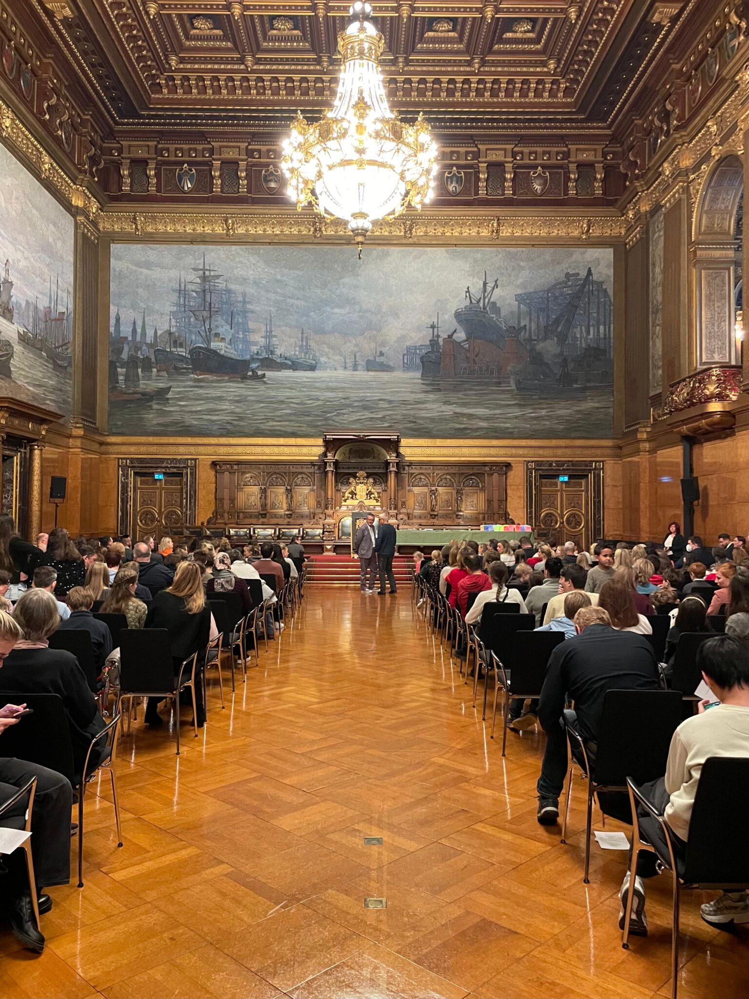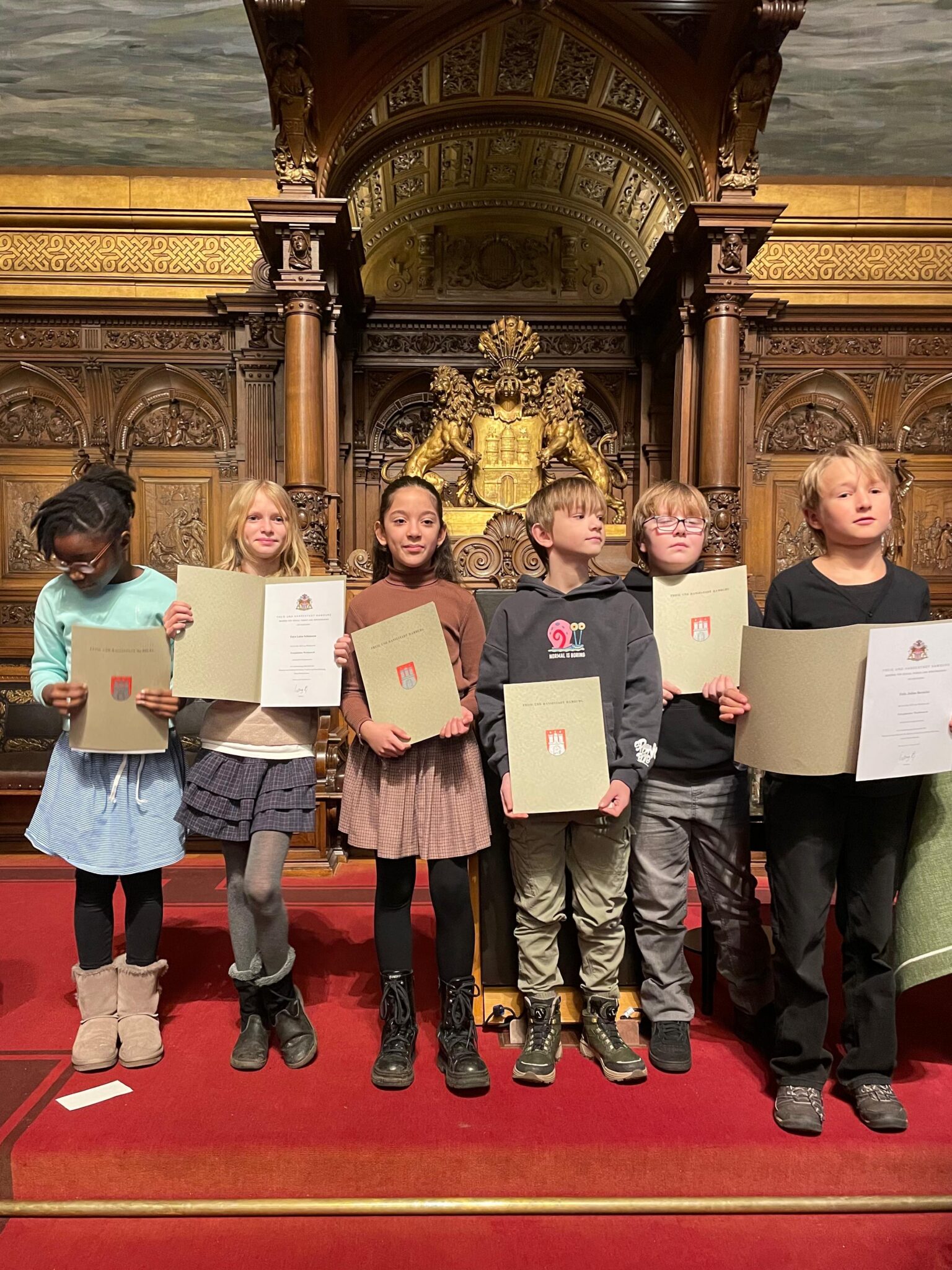 Am 3. Dezember durften die Preisträgerinnen und Preisträger aller Schülerinnen- und Schülerwettbewerbe einen ganz besonderen Ort besuchen: das Hamburger Rathaus. Alle ausgezeichneten Kinder aus ganz Hamburg waren eingeladen, dort noch einmal feierlich geehrt zu werden. Auch die Zirkusklasse 4d der Grundschule Am Heidberg war – wie schon in den vergangenen Jahren – erfolgreich beim Europäischen Wettbewerb vertreten und durfte sich über herausragende Preise freuen.