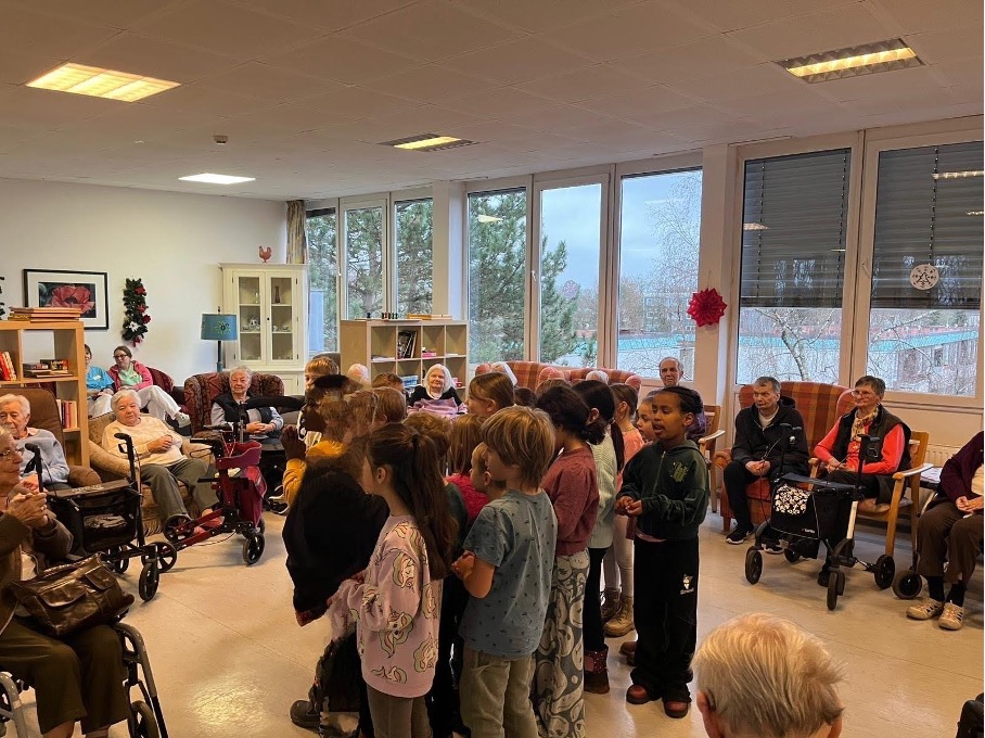Zum Abschluss besuchten wir noch eine weitere Station im Pflegeheim, trugen dort erneut das Gedicht vor und wurden mit einem kleinen Solo-Mundharmonika-Konzert überrascht. Dieser Besuch war für beide Seiten ein eindrucksvolles Erlebnis, das die Kinder nachhaltig begeisterte.